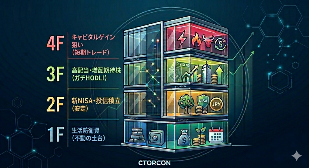 頭の中に描いているのは、基本的に4階建てのビル構造です。最下層のしっかりした土台から、上層ではリスクを取った攻めの投資まで、時間軸や資金管理の考え方が異なる投資手法を実践しています。この4階層を簡単に説明したいと思います。